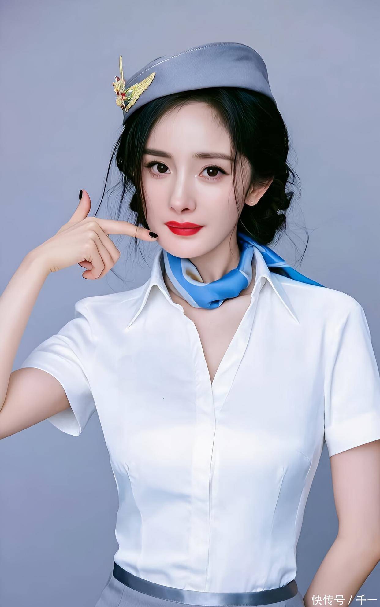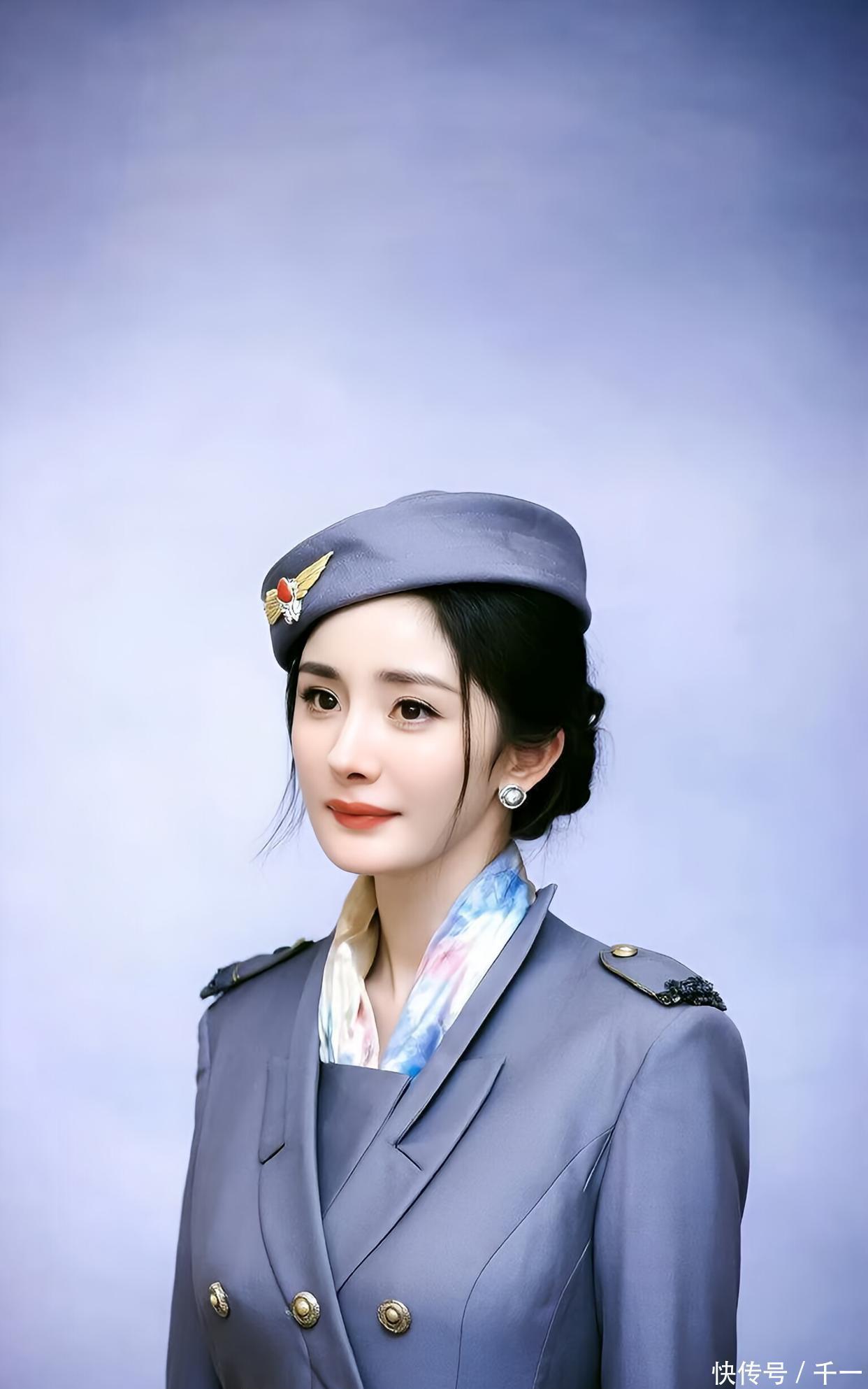 杨幂这套以黑白灰为主调的制服造型,展现了高级简约的职场时尚哲学。浅灰色西装外套配白色衬衫,下身搭配深灰色包臀裙,色彩层次分明而和谐。双排金色纽扣与黑色肩章为西装增添设计细节,内搭的扎染丝巾柔化了硬朗线条,体现“Mix Match”穿搭智慧——将正式单品与柔和元素结合,创造独特风格。贝雷帽上的金色徽章与红色宝石成为点睛之笔,为中性色调增加亮点。整体造型干净利落,背景的纯紫色更加凸显服装的剪裁与质感,杨幂盘起的发型与精致妆容完善了专业形象。